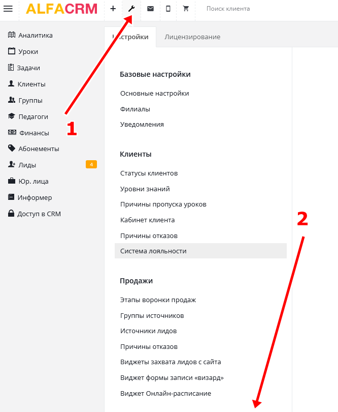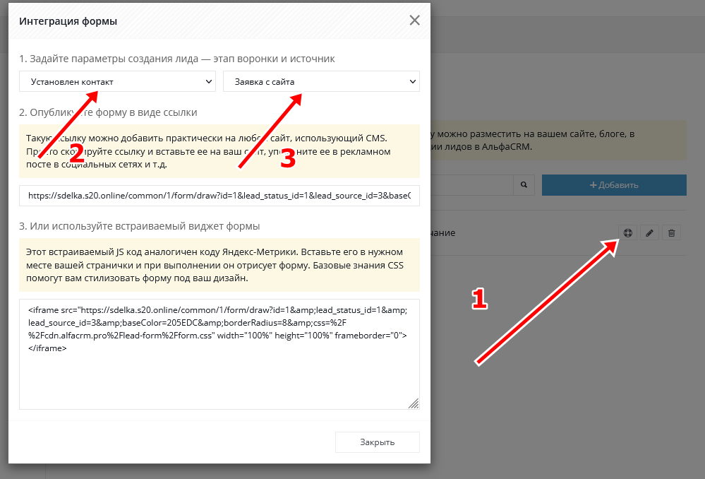Для интеграции системы с AlfaCRM, необходимо настроить триггер в личном кабинете AlfaCRM и правильно выбрать код вставки виджета формы захвата на сайт.