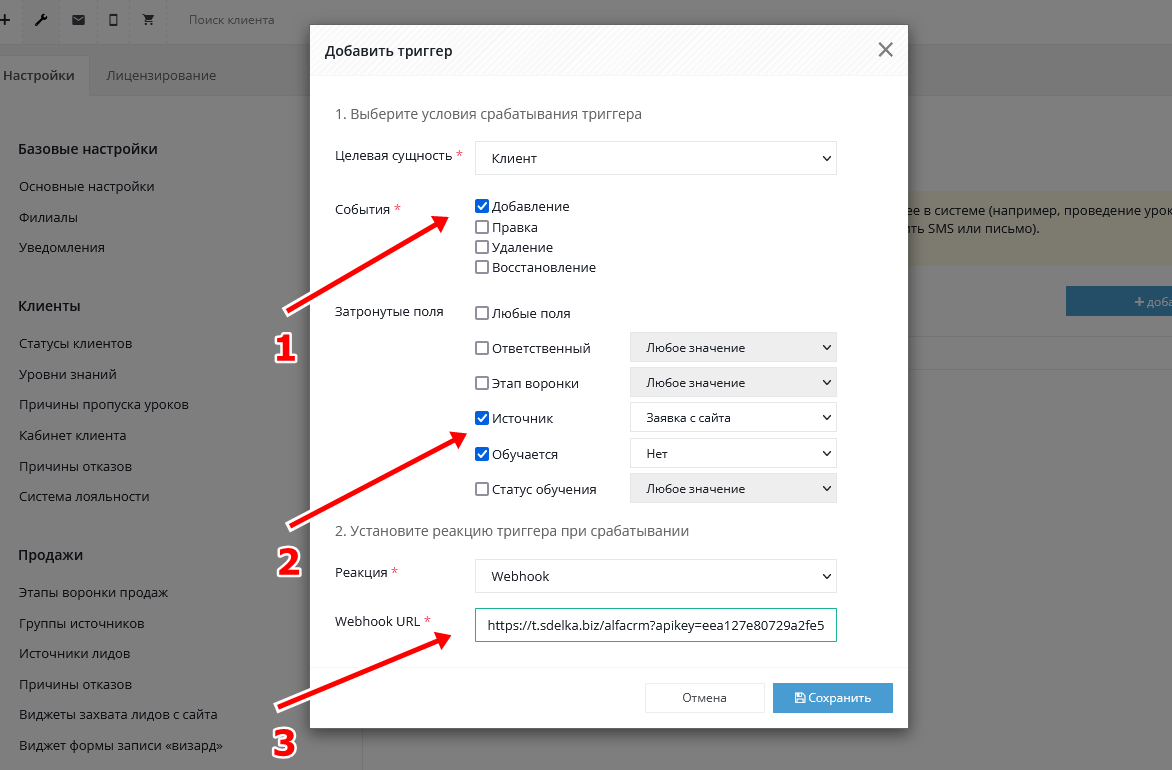 2.6 В Webhook URL укажите адрес https://t.sdelka.biz/alfacrm?apikey={apikey}.